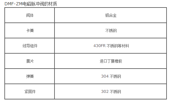 ZM型電磁脈沖閥的閥體,閥蓋采用鋁合金壓鑄制成,經(jīng)表面處理后,具有良好的防腐蝕性能。膜片及密封墊采用新工藝硫化和復(fù)合。電磁先導(dǎo)頭選用高效磁性材料和不銹鋼隔磁材料組成,彈簧和緊固件均采用不銹鋼材料。分氣箱(氣包)的接管和除塵器的噴吹管分別插入閥的進(jìn)出口。并擰緊二端壓緊螺母密封。
